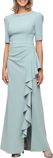 Fall for the statuesque silhouette of this puff-shoulder gown designed with a lustrous beaded neckline and a luscious cascading ruffle.