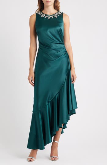 Radiate confidence in this satin cocktail dress featuring a dazzling neckline, a gracefully draped asymmetric hem and just the right touch of stretch for a flawless fit.