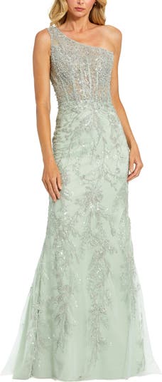 Elegant one-shoulder gown with stunning embellishments, perfect for adding a touch of glamour to any formal occasion.