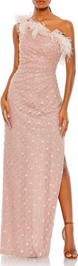 This embellished one-shoulder gown combines romance and elegance, featuring delicate embellishments and an asymmetrical feather neckline for a mesmerizing look.