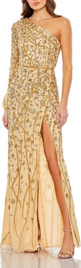 Make a striking impression in our embellished one-sleeve faux wrap gown. Intricate embellishments and a chic one-sleeve design create a refined, elegant look for formal events.