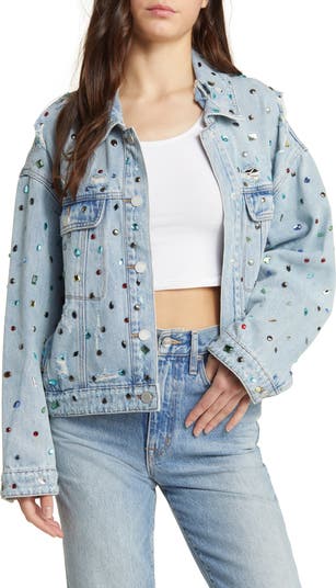 Glistening rhinestones lend glam attitude to a distressed denim jacket boasting a baby blue wash.