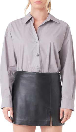 This polished poplin shirt is updated in an oversized silhouette and detailed with jeweled buttons.