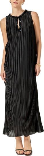 Fine allover pleats texture this flowy sleeveless maxi adorned with lustrous neckline embellishments.