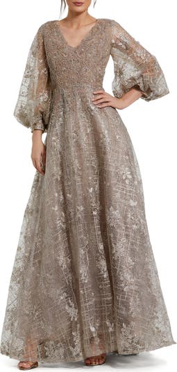 This elegant A-line gown features a plunging neckline, sheer long sleeves, and delicate embroidered details, perfect for any formal event.