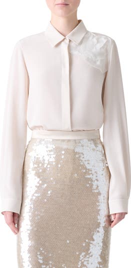 A scaled-up blossom embellishment sits at one shoulder like the memory of a beautiful corsage, romantically haunting this silk-crepe shirt tailored with a hem-flaring inverted back pleat.