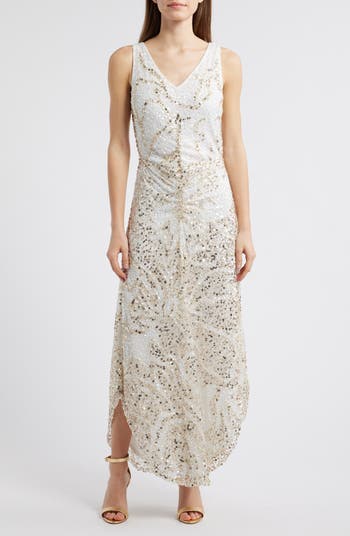 Sequins and beads shimmer all around a dazzling evening dress gathered softly at the waist.