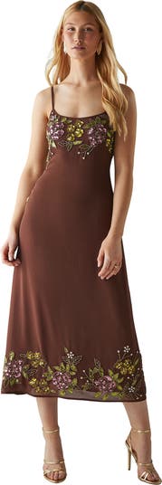 Make a statement at your next formal event with this exquisite hand-embellished strappy midi dress from Warehouse. The bias cut silhouette gracefully skims your curves, while the delicate strappy neckline adds a touch of allure. The dress features stunning sequin embellishments and intricate floral embroidery at the bodice and hem, creating a mesmerising visual effect.
