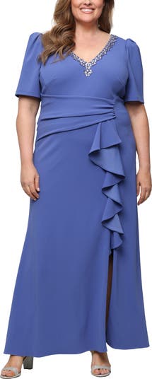 Framed by puff sleeves, this stretch-crepe gown features a dipped V-neck trimmed with sparkly embellishments and a cascading skirt that has a leggy side slit.