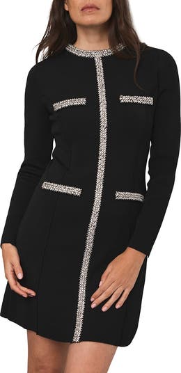 Dress in a mini silhouette featuring a crew neckline, long sleeves, embellished trim detailing and a zip fastening through the back.