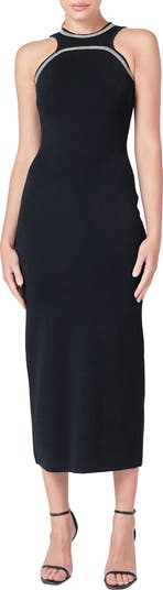 Twinkling rhinestones illuminate the neckline and yoke of this svelte knit dress that brings minimalist, but glam drama to any evening occasion.