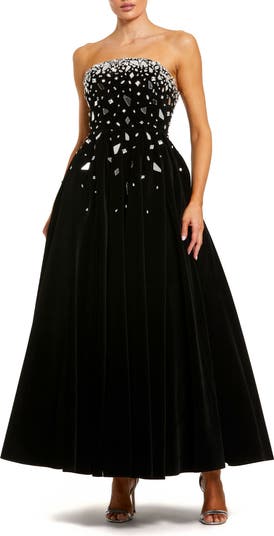 Strapless velvet gown with mirrored embellishments and pleated skirt—bold, elegant, and perfect for galas, parties, or red carpet events.