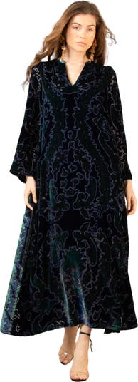 Velvet Burnout Jersey slip included Slim easy fit Long flared sleeve Slits at sides Maxi length (55.5” HPS)