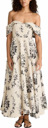 The perfect occasion piece, this dress has a nipped waist, constructed bodice, and a draped, off-the-shoulder detail. It has a full skirt, on-seam pockets, and is printed with a placed floral bouquet motif inspired by a long-lost vintage textile.