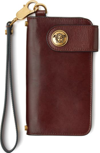 This long wallet in calfskin leather features a 3D Medusa snap and removable wrist strap and is designed to accommodate a phone.