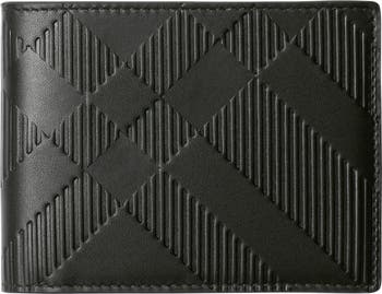 A slim bifold wallet in smooth calf leather with an embossed check pattern. The design is sized to fit US, Australian and Middle Eastern currencies.||Six card slots|Note compartment|Two slip pockets|Hand-painted edges|Embossed Burberry lettering at inner|Comes with a dust bag