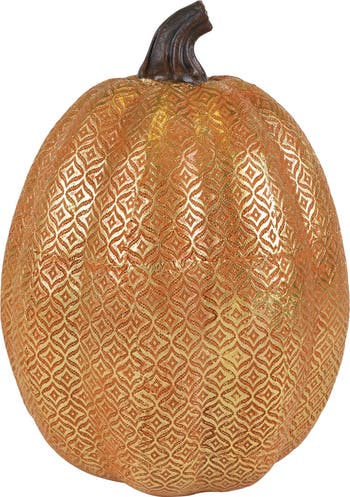 Elevate your fall décor with this pumpkin decoration, a stunning centerpiece for autumn and Thanksgiving displays. Featuring an intricate ogee textured design pattern, this decorated pumpkin blends classical elegance with seasonal charm, creating a sophisticated addition to any fall décor. The rich gold and warm orange tones complement traditional fall colors, making it an ideal accent for dining tables, mantels, entryways, or seasonal shelves. The detailed ogee texture adds depth and visual interest, setting this pumpkin apart from standard autumn decorations. Its compact size makes it versatile for tabletop arrangements, Thanksgiving centerpieces, or paired with other autumn décor such as gourds, leaves, and candles. Lightweight yet durable, it can be easily moved and displayed throughout the harvest season without worrying about damage. Perfect for Thanksgiving gatherings, fall parties, or everyday home autumn décor, this pumpkin combines elegance and festive appeal in one unique piece. Whether used as a standalone decorative item or incorporated into larger fall displays, the orange and gold pumpkin provides a sophisticated, timeless accent that enhances fall decorating. Its ornamental design ensures it stands out while blending seamlessly with both modern and traditional home styles. Features: Blended shades of orange and metallic gold Orange backdrop with an embossed metallic gold ogee pattern Perfectly suited for tabletop display or enhancing your dining table centerpieces Recommended for indoor decorative use only Dimensions: 9.75" high x 7.25" diameter Material(s): resin