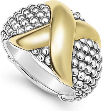 A pillowy 18-karat gold 'X' marks the spot against signature Caviar beading on this elegant sterling silver dome ring.
