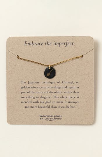 The Japanese tradition of kintsugi—meaning "golden joinery"—treats breakage and repair as part of an object's history, not something to hide. Inspired by this art form, Emilie Shapiro has crafted this sterling silver pendant, carefully sawn in half and fused back together with 14k gold, symbolizing strength, beauty, and transformation. Oxidized to enhance the contrast between silver and gold, this meaningful necklace serves as a wearable reminder that challenges shape us into something even more whole. Handcrafted from sterling silver, intentionally broken and repaired with 14k gold to create a striking contrast. Pendant measures ½"H x ⅜"W, delicately sized for everyday wear. Suspended from an 18"L chain. Includes a meaningful card explaining the symbolism of kintsugi. Handmade in New York by Emilie Shapiro and a team of female artisans.