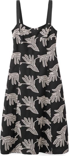 Lattice-embroidered foliage makes a statement adop this A-line midi dress with a classic sweetheart neckline.