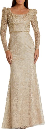 This elegant gown boasts intricate embroidered detailing and a flattering trumpet silhouette, with long sleeves for added sophistication, perfect for formal events.