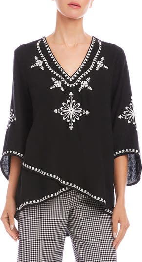 A front crossover hem dips lower in back to enhance the fluid movement of this airy linen-blend top trimmed with graceful floral embroidery and framed by fluttery sleeves.