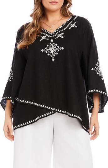 A front crossover hem dips lower in back to enhance the fluid movement of this airy linen-blend top trimmed with graceful floral embroidery and framed by fluttery sleeves.