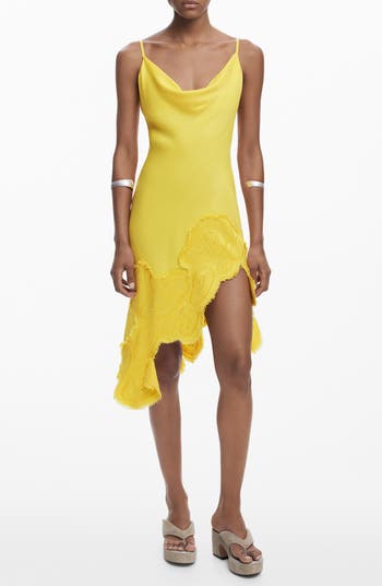 Embroidered letters and frayed edges put a signature stamp on this sunny satin slipdress framed by a draped cowl neck and flirty asymmetric hem.
