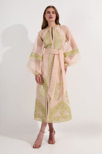 This enchanting embroidered organdie dress from Karen Millen showcases exceptional craftsmanship with its ornate detailing and considered design. The dramatic balloon sleeves create a contemporary silhouette whilst the intricate embroidery adds a touch of artisanal luxury. Perfect for formal occasions, this piece commands attention at weddings, race days and evening soirees. Style with minimal strappy heels as shown for an elegant finish, allowing the dress to remain the focal point.