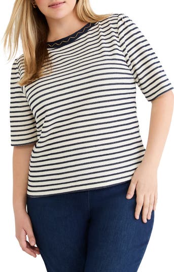 Subtle embroidery details highlight the boat neck of this crisply striped T-shirt that's an elevated staple for layering or standalone wear.