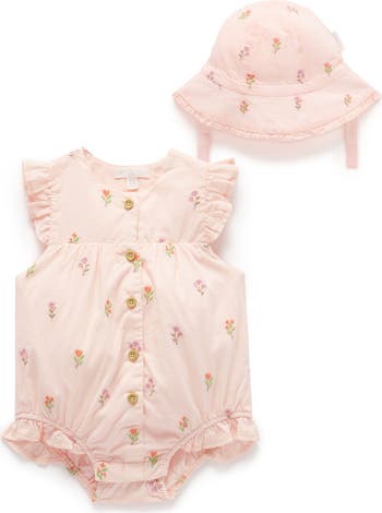 Our sweet Sprig Bodysuit & Sun Hat Set is the perfect outfit for those special occasions on hot summer days. Featuring a pretty all-in-one with ruffle details on the shoulders and legs, a sweet all over floral embroidery and snap clips at the leg for easy dressing. Complete the outfit with the matching ruffle sun hat. Made from the softest 100% Cotton for a lightweight and breathable look.