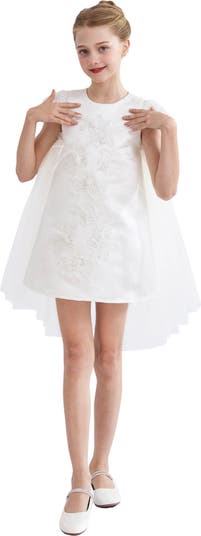 - 100% PolyesterSleeveless gown with decorative cap sleevesFitted bodice with vertical floral appliqué and beadworkLayered skirt with sheer tulle underlay for volumeElegant ceremonial design for weddings, christenings, and formal occasionsImported