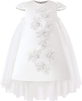 The Briavelle dress is a stunning ceremonial piece, featuring short embroidered sleeves and a flared A-line silhouette. Adorned with floral appliqués, beads, and sequins, its layered tulle underskirt adds graceful volume, making it perfect for weddings, christenings, or formal celebrations.