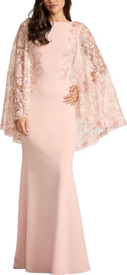 A lacy cape adds infinite romance to a petal pink gown offered in a sheath silhouette.
