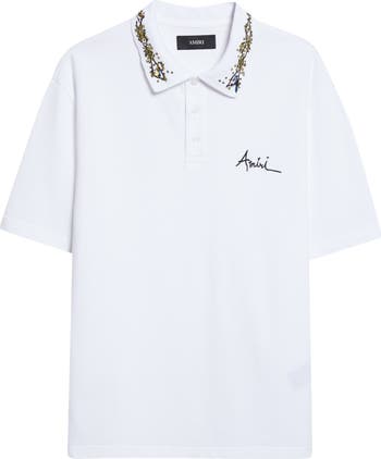 Embroidered birds and botanical motifs embellish the ribbed collar of this cotton polo constructed with a classic three-button placket and branded signature at the chest.