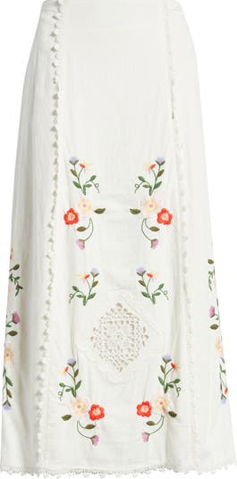 Airy eyelets let cool breezes flow through this cotton midi skirt finished with vibrant embroidered blooms.