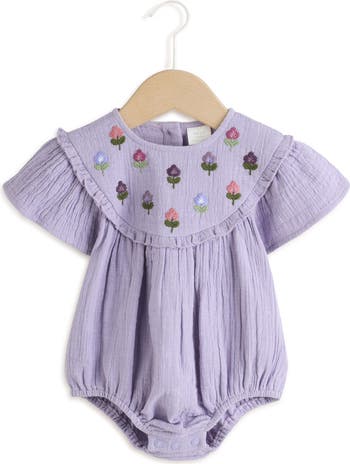 Embroidered blooms sweeten the yoke of this frilly bodysuit cut from cool cotton gauze for baby's comfort.