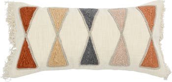 - This boho-inspired lumbar pillow showcases intricately woven, geometric embroidery on cotton finished with soft decorative fringe