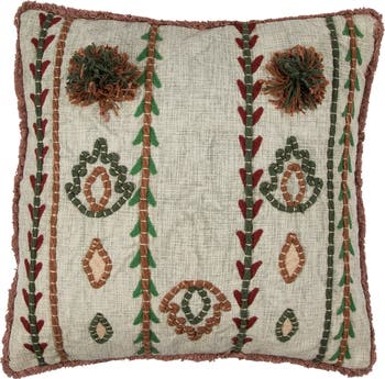 - This bold, textural throw pillow showcases intricately embroidered patterns on woven cotton, finished with delicate fringe