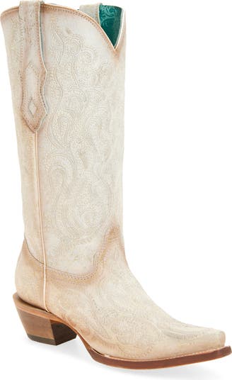Intricate topstitching textures the richly crackled leather of a striking cowboy boot designed with a snip toe and stacked heel in a creamy palette. A moisture-wicking lining and plush cushioning help keep you comfortable all day long.