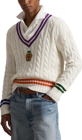This V-neck sweater captures that classic athletic energy with a cable-knit build and bright multicolored striped trim that defines the silhouette. The embroidered crest at the chest, a nod to the brand's founding year, adds a heritage detail that makes the whole piece feel intentional and collector-worthy.