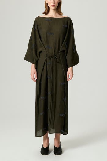 Embrace effortless elegance with this embroidered kimono-style maxi dress. Designed in a relaxed fit with a wide boat neckline and flowy kimono sleeves, it features a self-tie waist to define your silhouette. Crafted from crinkled textured fabric adorned with delicate scattered embroidery, this slip-on style flows into a straight maxi hemline for timeless sophistication. Perfect for sunlit strolls, evening events, or anything in between.