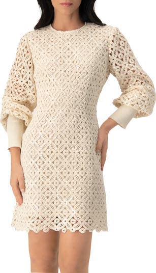 Mini dress crafted in delicate embroidered crochet, subtly embellished with sequins for a hint of shimmer. Designed with puffed long sleeves and ribbed knit cuffs for a refined, textured finish