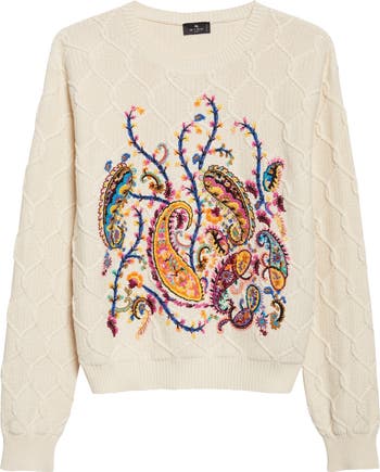 The label's iconic paisley swirls are rendered in vivid embroidery on a subtly cropped sweater knit with interlocking cables.
