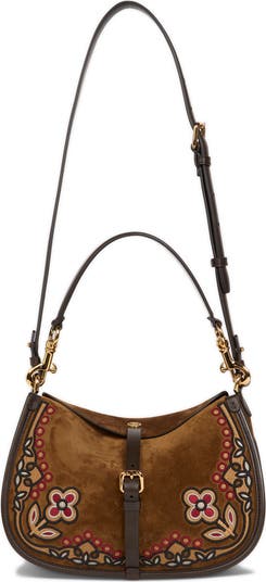 Distinctive, colorful embroidery decorates this suede bag edged with leather binding and fitted with removable crossbody and shoulder straps for versatile carry options.