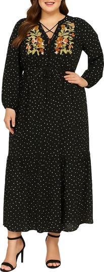 Bring a boho beat to dress day in a delightfully dotted maxi set with full sleeves and embellished with vibrant embroidery.