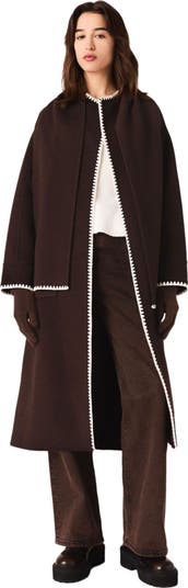 This season, Maje is reinventing the essentials to envelop your figure in softness and modernity. A statement coat, ideal for the first cold days. With its loose fit and oversized collar, this double-faced wool coat envelops your figure in a graphic cocoon. The contrasting embroidered finishes highlight its clean design, while the integrated scarf offers a functional and chic touch.Wear it with wide-leg jeans and an ecru sweater, and add tone-on-tone gloves to accentuate the wintry feel.