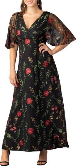 - Floral mesh embroidered fabric, lined bodice and skirt, back zipper, pretty flutter sleeves and an empire waist.