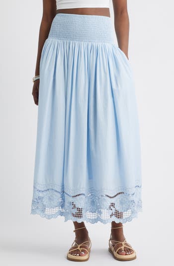 Breeze through your day in this airy cotton skirt that's fashioned with a wide smocked waist and a border of charming embroidered eyelets.