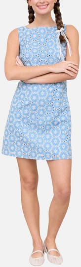 Intricate eyelet embroidery lends charming detail to this cotton-blend denim minidress topped with a clean boat neckline.
